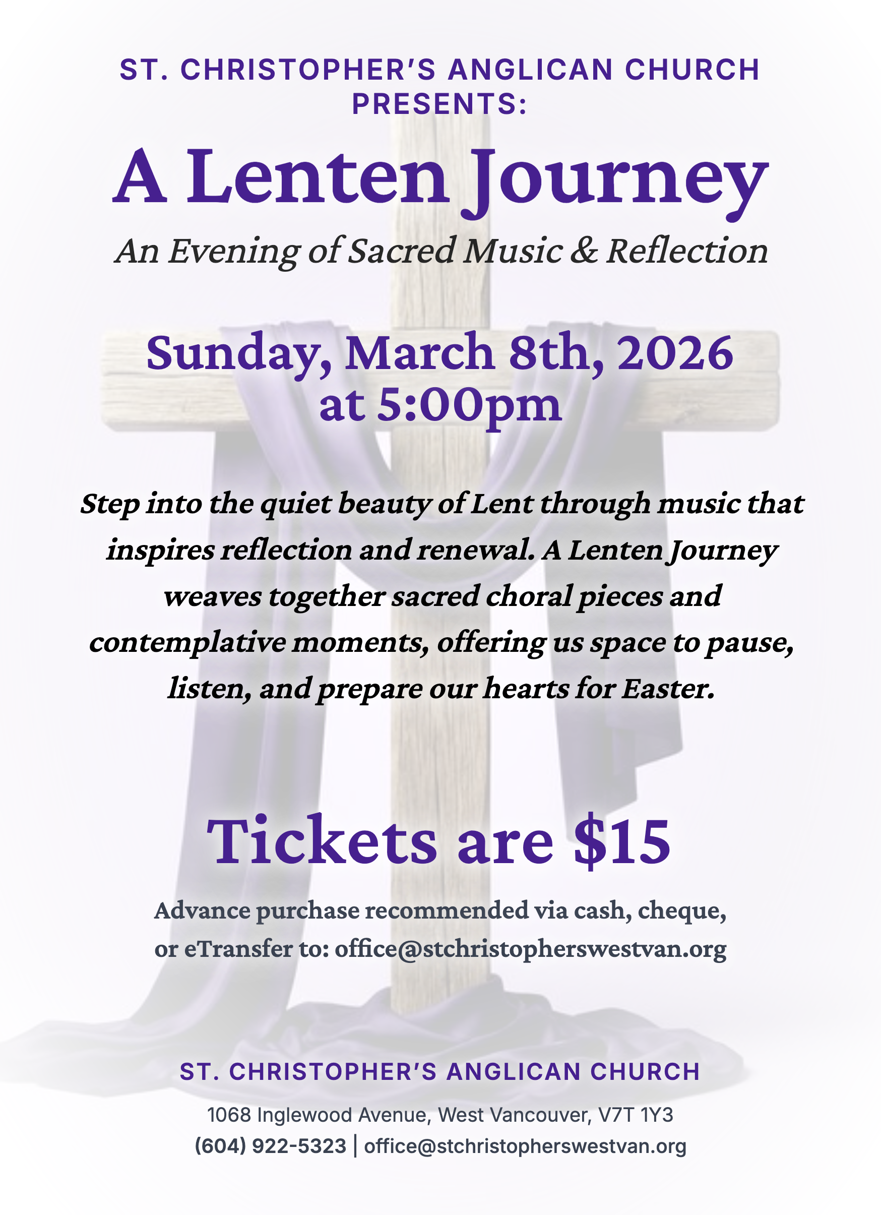 Tickets are $15 - Advance purcahse is recommended via cash, cheque or eTransfer to: office@stchristopherswestvan.org